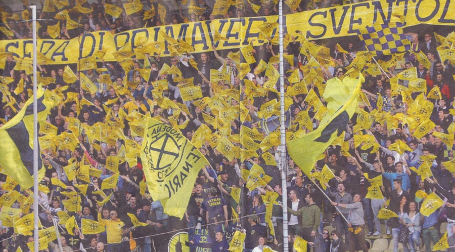 Il tripudio dei tifosi modenesi della "curva Montagnani", per festeggiare i 100 anni del Modena, caduti esattamente il giorno prima