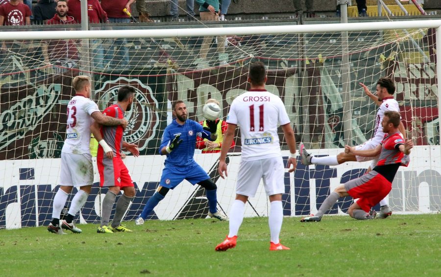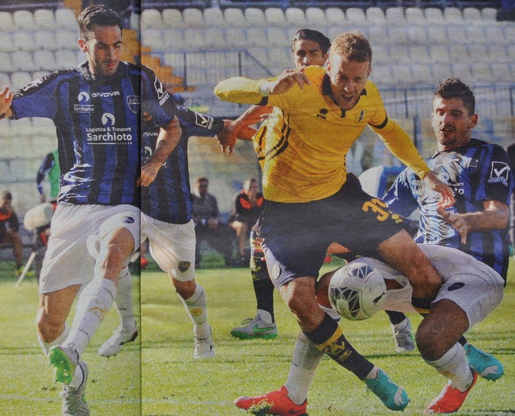Francesco Stanco, in Sambenedettese-Albinoleffe (serie C – aprile 2018), tenta la via del gol con un acrobatico colpo di testa (da Rai Sport)
