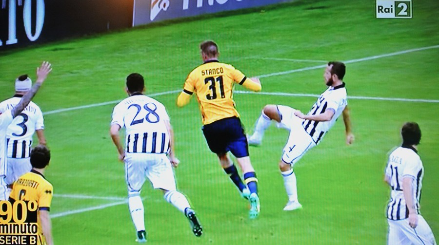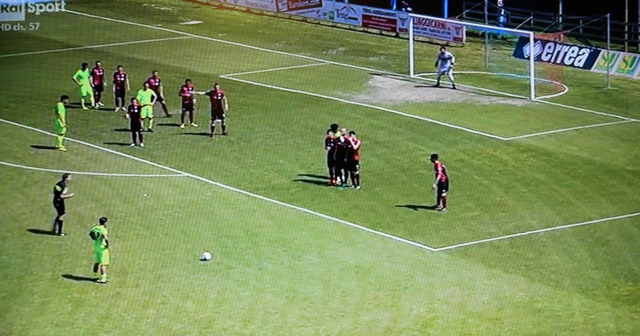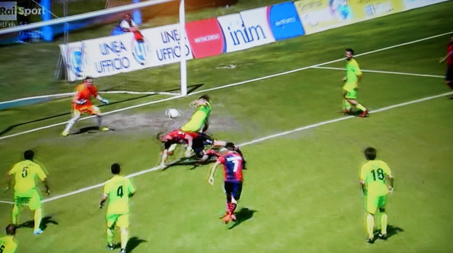 Francesco Stanco, al centro dell’area, in Sambenedettese-Albinoleffe (serie C – aprile 2018) (da Rai Sport)