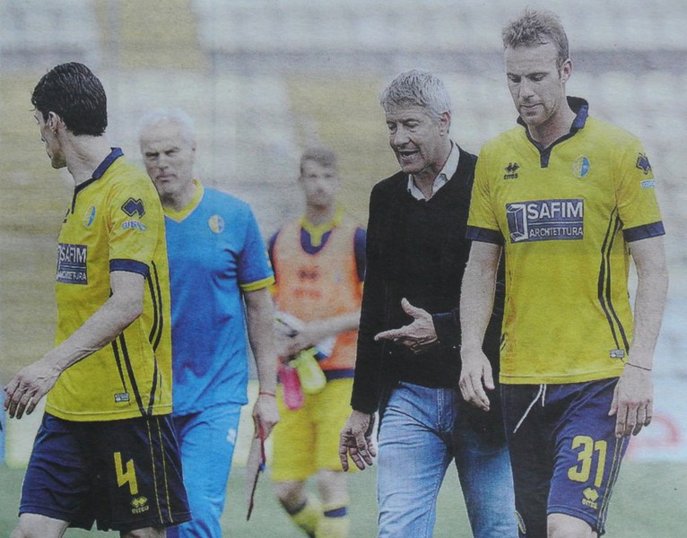 Francesco Stanco, Riccardo Nardini e l’allenatore Bergodi delusi nella primavera 2016: il Modena retrocede in Lega Pro